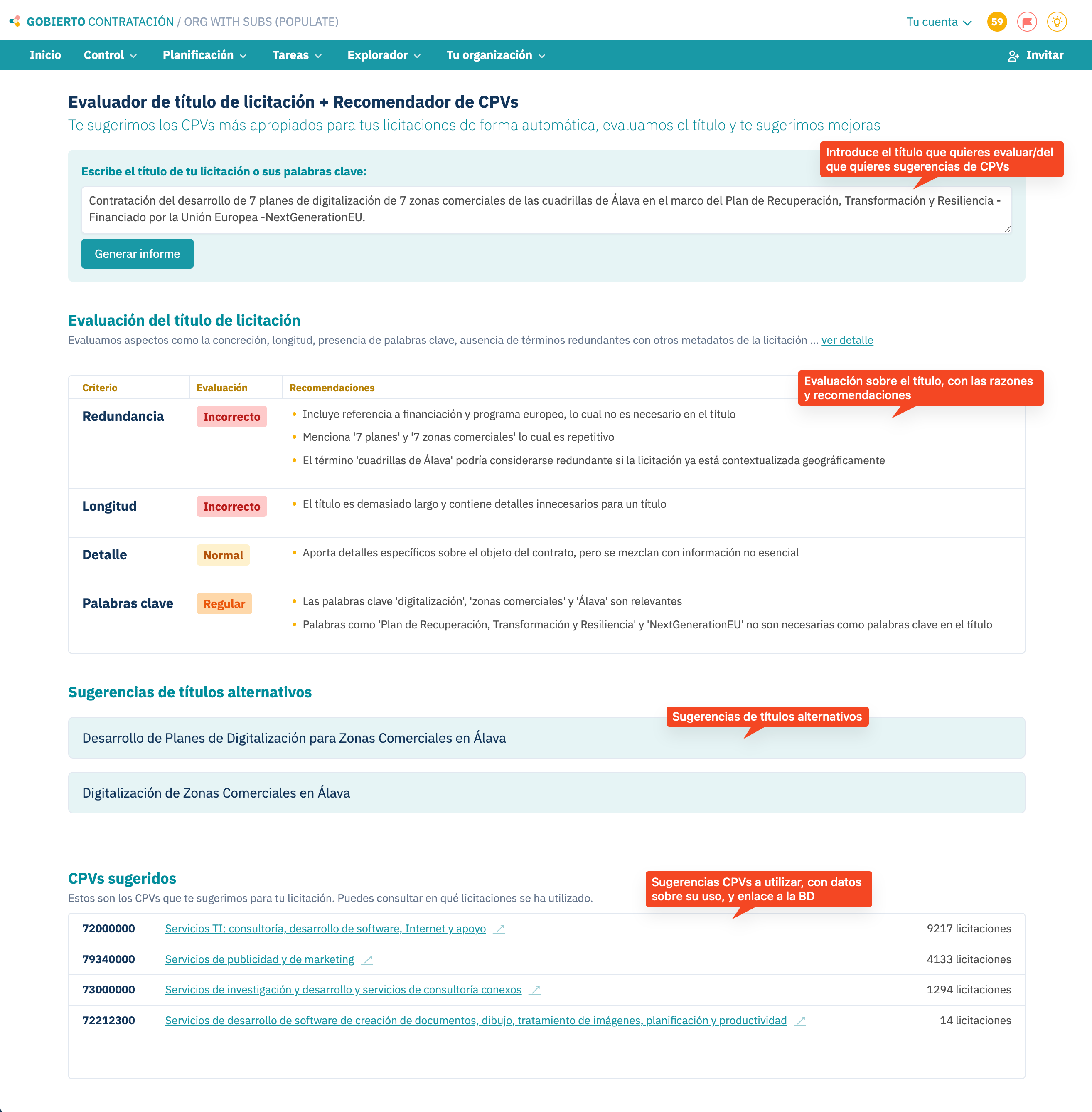 - evaluación del título: su adecuación a una serie de criterios que hemos considerado como buenas prácticas a la hora de definir un buen título. Más información: Cómo escribir un buen título de licitación y elegir los CPVs más adecuados